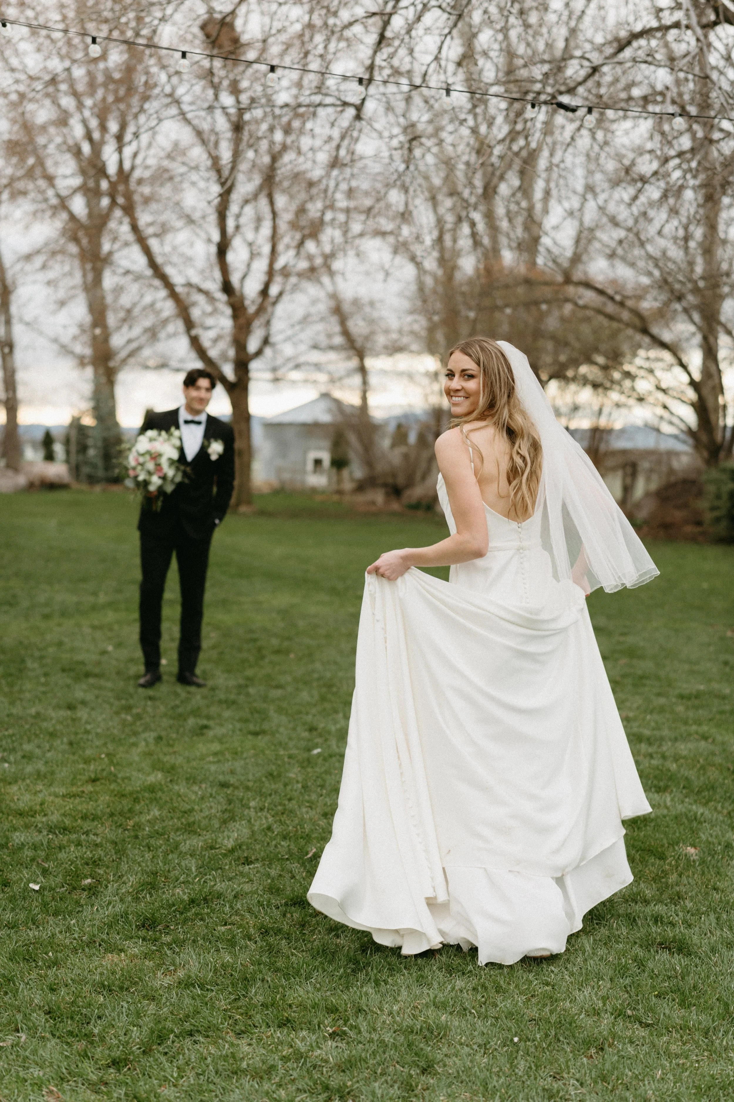A bride smiles back at the camera while holding her gown, with the groom waiting in the background holding a bouquet. The trees are bare, the grass is green, and the soft winter light creates a romantic, timeless atmosphere. Captured by Salt & Sand Photography.