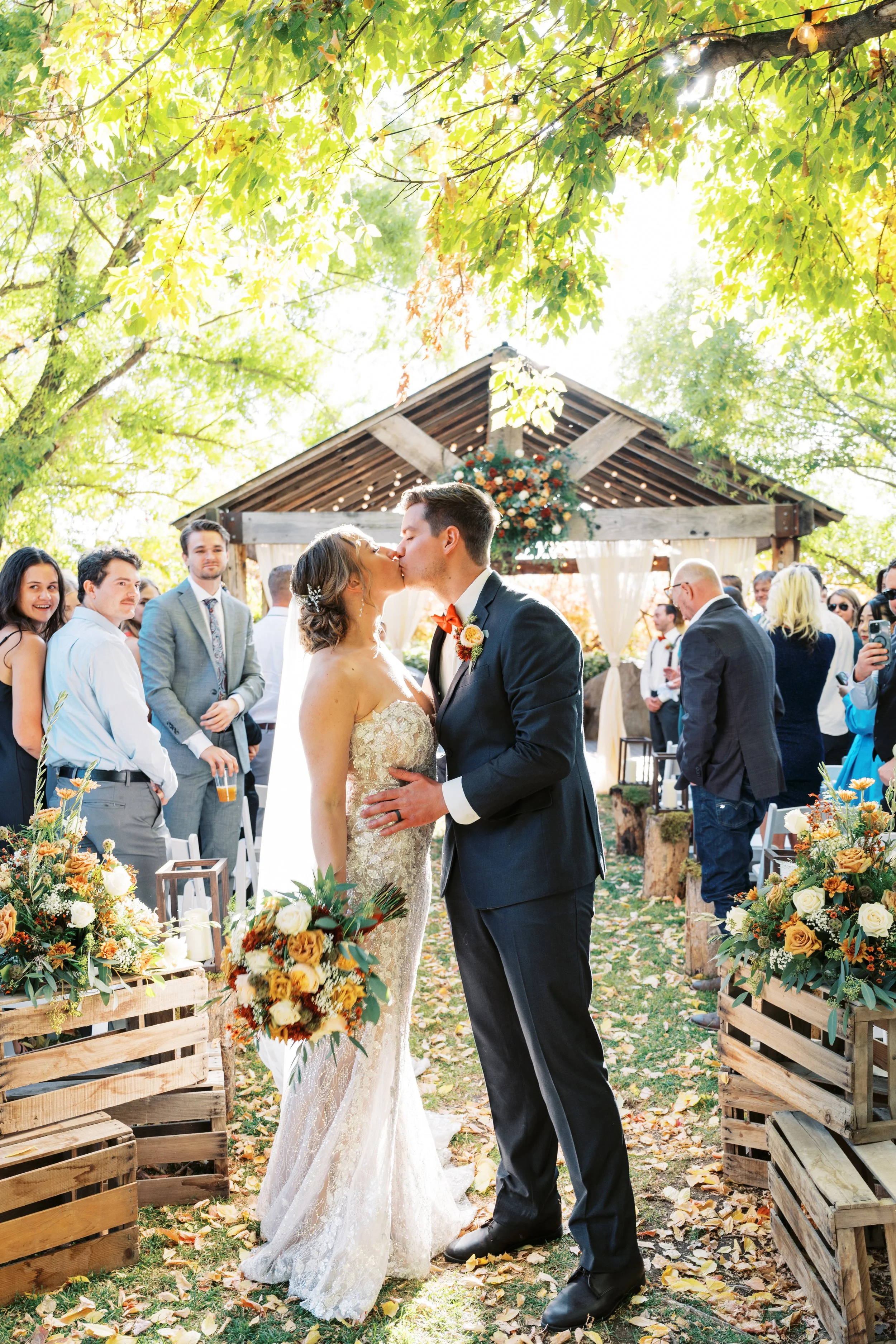 A bride and groom share a kiss at their outdoor fall wedding ceremony at Sunnyside Farm. The bride wears a strapless lace gown and holds a bouquet of autumn blooms in shades of burnt orange, cream, and gold. The groom wears a dark suit with a seasonal boutonniere. Guests smile from their seats as golden leaves scatter the aisle, which is lined with rustic wooden crates, lanterns, and lush fall floral arrangements beneath a wooden arbor draped with fabric and greenery. Captured by Anna Perevertaylo Photography.